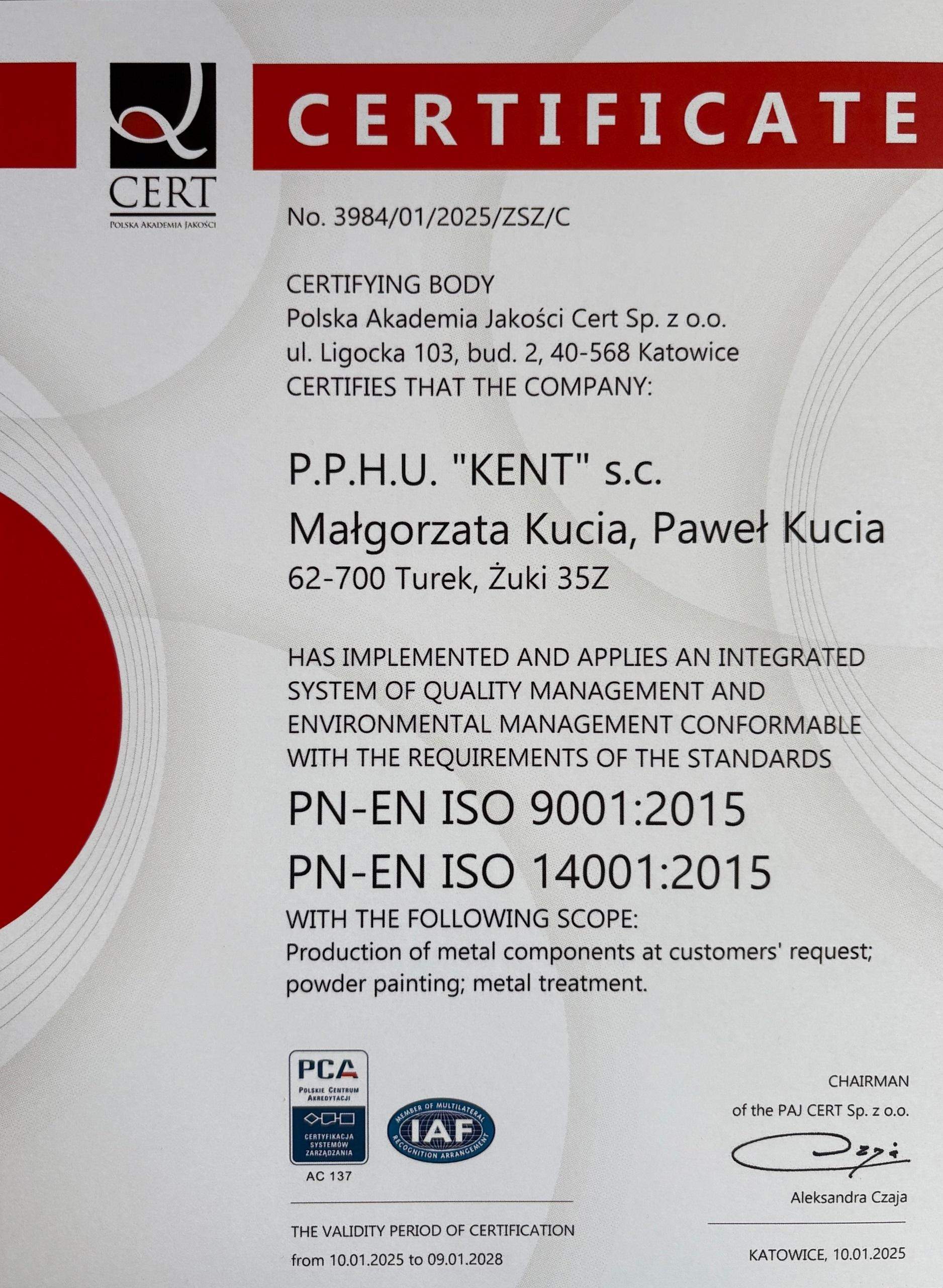 Firma "KENT" istnieje na rynku od 1995 roku. Jakość wyrobów wykonywanych na zlecenie klientów, według ich dokumentacji i wymogów oraz terminowość dostaw zaowocowała współpracą z wieloma firmami na terenie Polski i Europy. Świadczymy profesjonalne usługi w zakresie wypalania laserowego blach i rur, toczenia i frezowania na obrabiarkach CNC, gięcia różnych grubości blach, rur i prętów, spawania elementów konstrukcyjnych oraz różnego rodzaju korpusów metodą TIG i MIG, jak również usługi malowania proszkowego powierzchni metalowych. Zatrudniamy ponad 80 specjalistów z różnych dziedzin obróbki mechanicznej metalu, a posiadany park maszynowy z roku na rok się powiększa i jest unowocześniany. Potwierdzeniem naszej jakości oraz dbałości o środowisko są wdrożone w 2024 roku: System Zarządzania Jakością oparty na normie ISO 9001 oraz System Zarządzania Środowiskowego oparty na normie ISO 14001.
